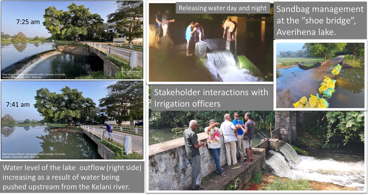 - In both situations, the Department of Irrigation and the Sri Lanka Land Development Corporation (SLLDC) managed the water tables well, releasing on 28th water from the Thalangama lake towards the smaller Averihena lake and from there the Kelani River. On the 30th, this option was gone, and water was released e.g. into paddy fields.